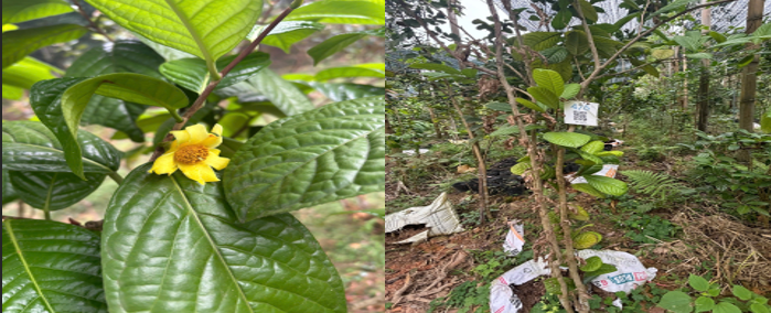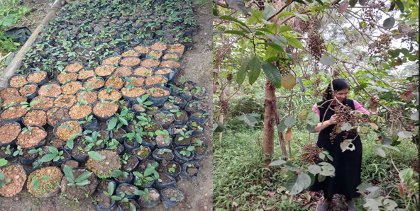 Hình: Ươm giống cây Nhất huyết mộc từ hạt( bên trái) và cây Nhất huyết mộc 4 năm tuổi đang cho trái (bên phải)