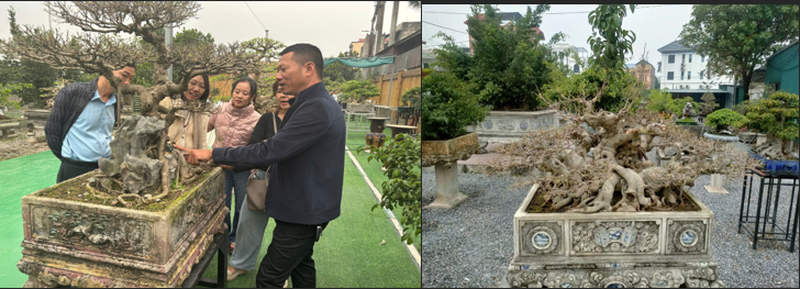Hình: Đoàn được các nghệ nhân chia sẻ kỹ thuật trồng và chăm sóc các loại cây bonsai